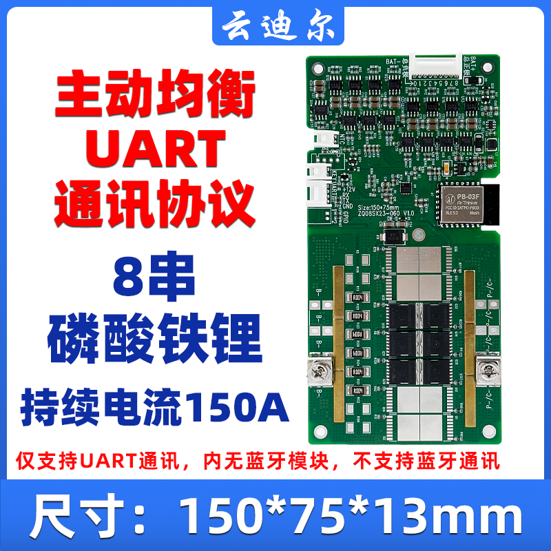 固定串数8串磷酸铁锂负极同口仅UART通讯持续电流150A主动均衡0.4A